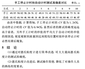 恩氏粘度計采用人工卡秒表的方式計時, 這樣就存在人為的操作誤差。 另外, 操作人員需用肉眼監(jiān)視量瓶中流入漿液的液面是否到達刻度線位置, 以停止秒表計時 , 這也勢必存在著視覺誤差。 操作誤差和視覺誤差必然導(dǎo)致其測試準確度低。為盡量減小這些誤差, 操作人員需經(jīng)過長期訓(xùn)練, 而且**好能長期固定檢驗人員, 不同檢驗人員測得的數(shù)據(jù)的可比性較差。3 提高恩氏粘度計測試準確度的措施
