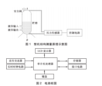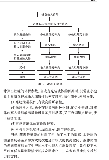 [9-11]。 LCD 可直接顯示液體的種類、質(zhì)量和液面高度。 貯罐規(guī)格改變時,輸入其內(nèi)徑和高度便可得到其體積參數(shù)。 液體種類改變時,只需在鍵盤上重